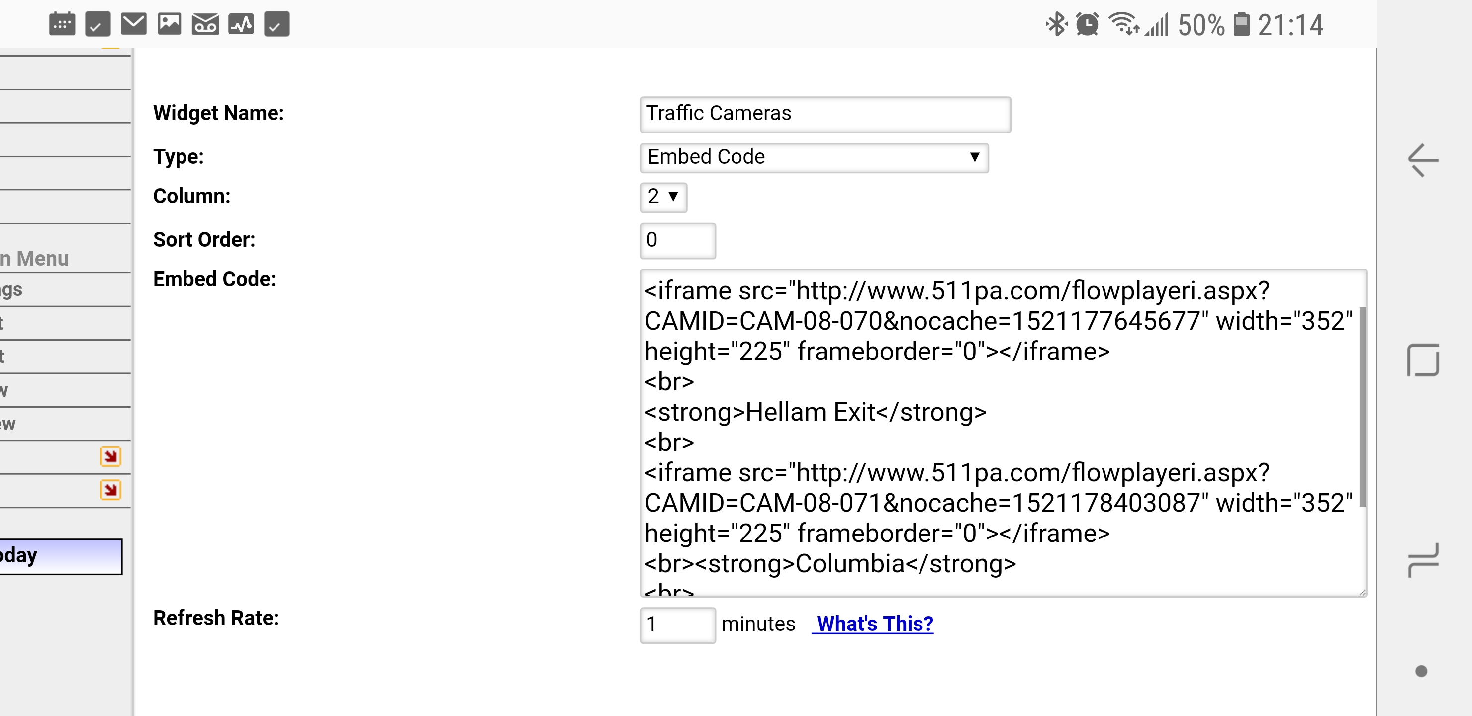 Although it took me a while to go through the HTML and find the code, I was able to use the embed widget to have the PennDOT cameras show on our board that are relevant to our area.